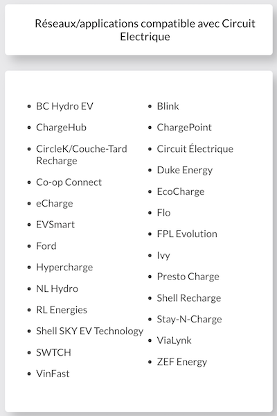 Par exemple, voici les réseaux compatibles avec le Circuit électrique. À l’aide de votre carte de membre ou de votre application mobile du Circuit électrique, il sera donc possible de démarrer et de payer les recharges sur ces réseaux.