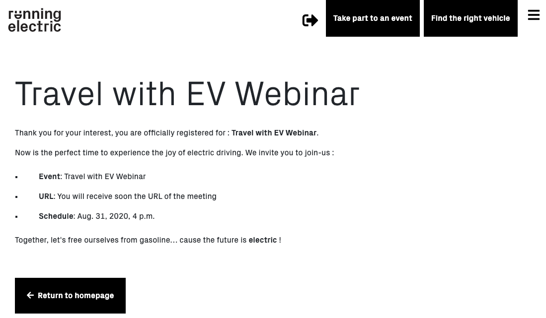 1-From there, the public will be able to register to your event, the information will be seamlessly communicated to Zoom, and the registrants will receive the proprer invitation URL to Zoom as part of the registration process. For the public, it typically looks like any other Roulons Electrique participation :